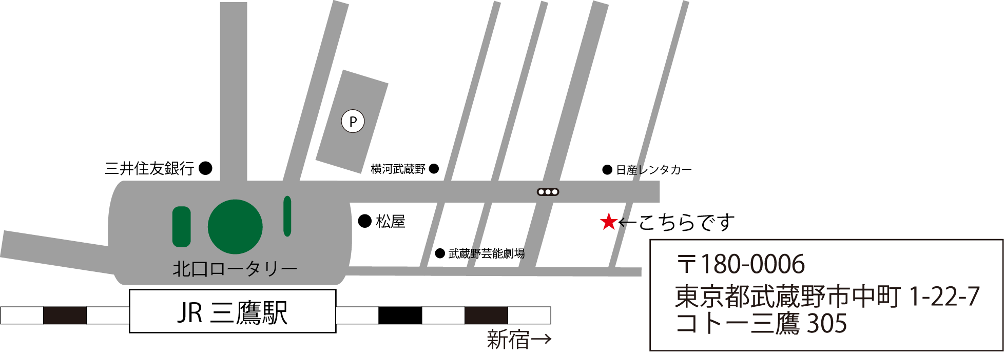 〒180-0006 東京都武蔵野市中町 1-22-7 コトー三鷹 305